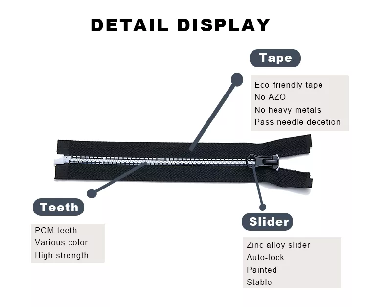Ekologiczny zamek błyskawiczny TRC z tworzywa sztucznego pochodzącego z recyklingu jest wykonany z tworzywa sztucznego pochodzącego z recyklingu, co rewolucjonizuje nowoczesny design, łącząc trwałość, wyjątkową wydajność i innowacyjne koncepcje. Zamek ten, wykonany z plastiku pochodzącego z recyklingu i poliestru pochodzącego z recyklingu, zachowuje tę samą gładkość i wytrzymałość na rozciąganie, co konwencjonalne zamki z tworzywa sztucznego, jednocześnie znacznie zmniejszając ilość odpadów produkcyjnych i wpływ na środowisko. Te cechy sprawiają, że ekologiczny zamek błyskawiczny TRC z tworzywa sztucznego pochodzącego z recyklingu jest idealnym wyborem do odzieży sportowej, odzieży outdoorowej, akcesoriów podróżnych i przedmiotów codziennego użytku, które łączą w sobie wydajność i odpowiedzialność za środowisko.