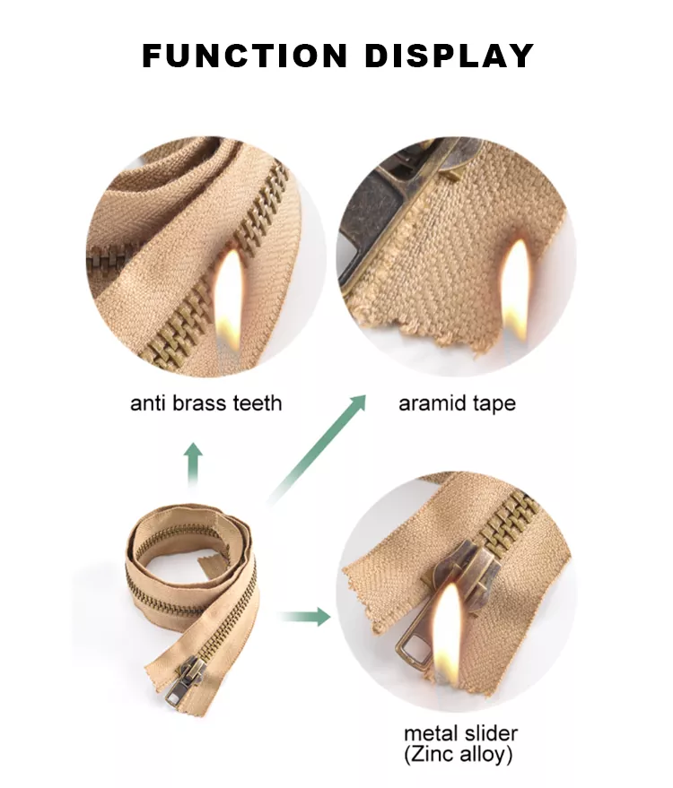 Ognioodporny metalowy zamek błyskawiczny TRC wykorzystuje taśmę trudnopalną o właściwościach samogasnących, co zapobiega ich spaleniu lub zapaleniu w powietrzu, łącząc bezpieczeństwo i trwałość. Doskonała odporność na ciepło gwarantuje, że nawet po krótkotrwałym wystawieniu na działanie wysokich temperatur wynoszących 300°C nie kurczy się, nie staje się kruchy ani nie topi się, co czyni go idealnym wyborem do zastosowań wymagających wysokiego poziomu ochrony.