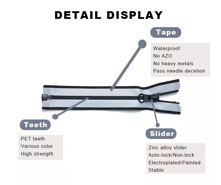 Wodoodporne zamki nylonowe TRC wykonane są z nylonowych zębów o dużej gęstości i wzmocnionej taśmy poliestrowej, pokrytych trwałą folią TPU lub PU. Tworzy to bezszwową barierę, która zapewnia skuteczną wodoodporność przy jednoczesnym zachowaniu elastyczności zamka i jego płynnej pracy. Produkt ten, przeznaczony do zastosowań zewnętrznych i wymagających dużej wydajności, zapewnia trwałą odporność na ścieranie, korozję i odkształcenia. Niezależnie od tego, czy stosuje się je w kurtkach, odzieży sportowej, plecakach, namiotach czy sprzęcie ochronnym, wodoodporny nylonowy zamek błyskawiczny TRC zapewnia idealną równowagę pomiędzy funkcjonalną ochroną a nowoczesnym designem, zapewniając, że każdy szczegół jest zarówno stylowy, jak i funkcjonalny.